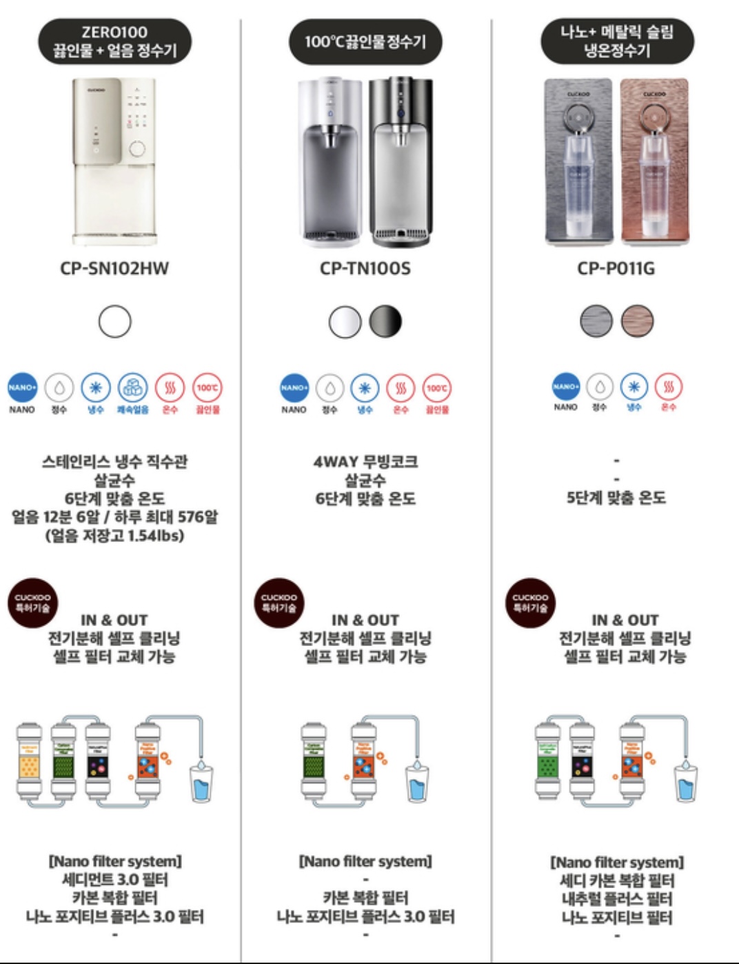 모델은 나노 필터 시스템을 사용해 물의 질을 높여줘요. 또한, CP-AD011 UGW(S) 모델은