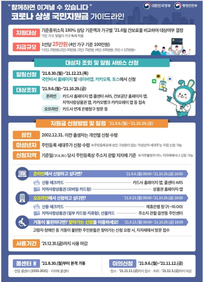 1인당 25만원 수준이며 21.9/6일부터 지급 예정입니다. 또한 신청 마감일은 21.10/29일으로 일정 꼭 준수해주세요.