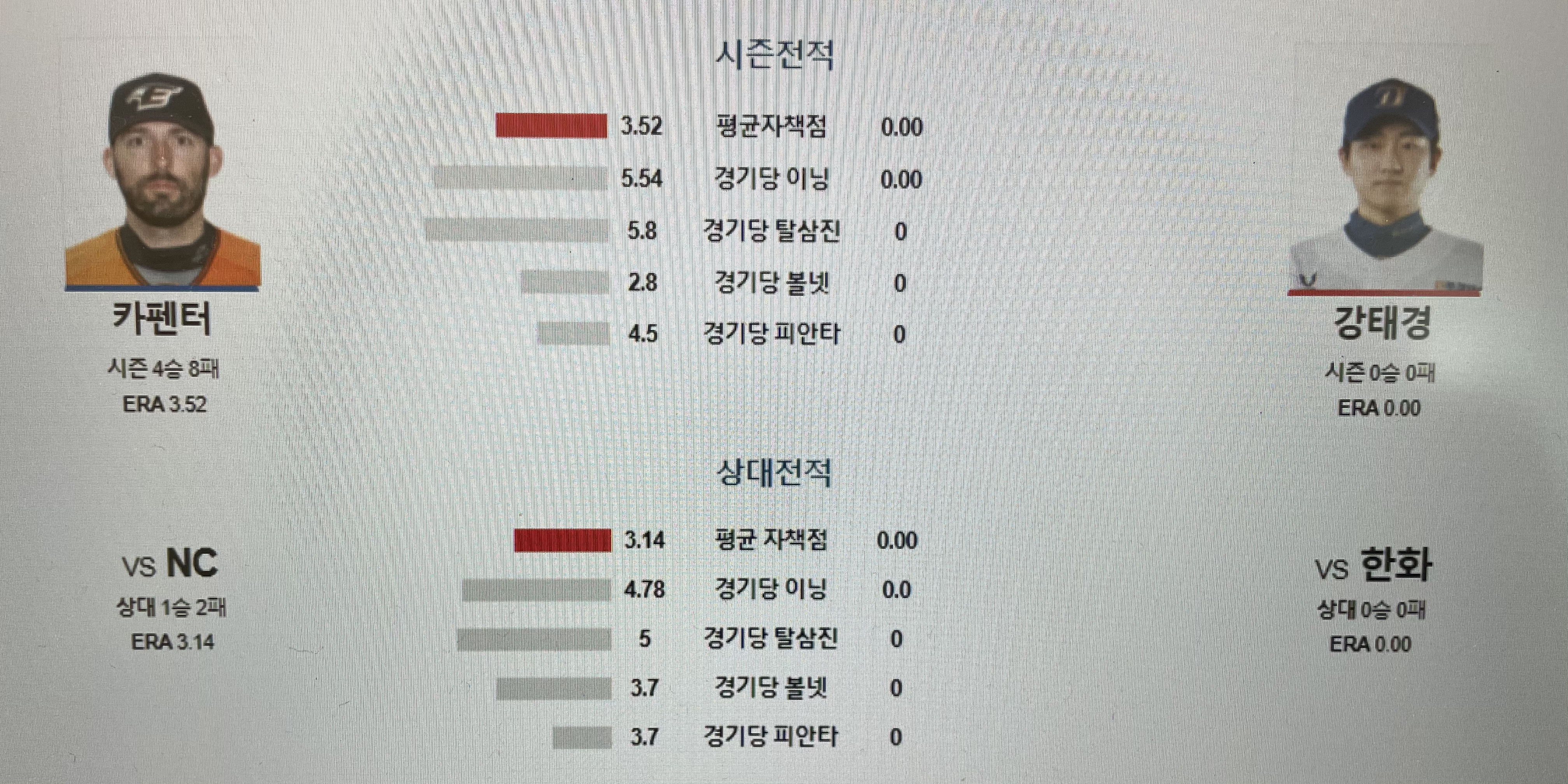 또한, 카펜터 선수는 왼손 투수로서 큰 키 196cm에서 내리꽂는 패스트볼이 강점이며 두산의 레전드 니퍼트라는 말을 들으면서 올해 시작을 하였습니다. 비록 현재 승/패 기록은 4승 8패이나 한화 경기력을 감안해서 보면 방어율 3.52는 결코 못하지 않는, 그보다 1,2 선발을 다툴 수 있는 투수라고 생각됩니다.